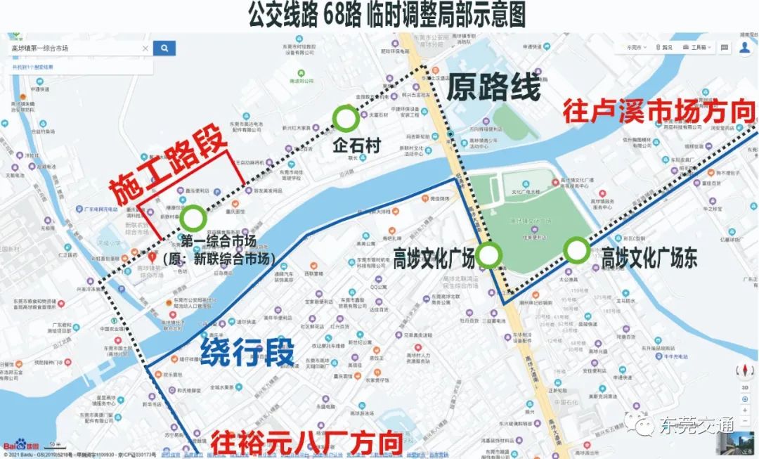 高埗镇中心西路第一综合市场段道路施工期间,公交线路4路、63路、65路、68路临时取消停靠“第一综合市场、企石村”站。
