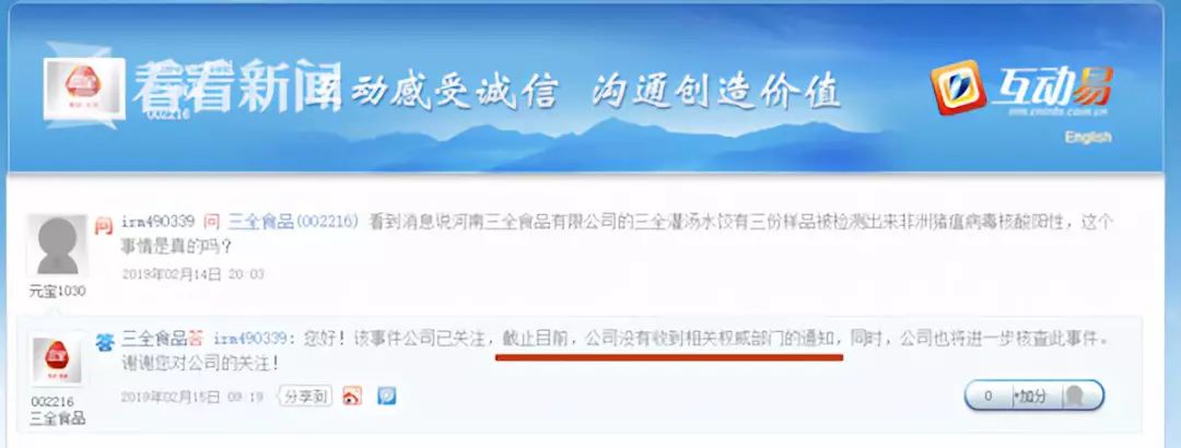 同日,面对提问“有消息称三全食品的三全灌汤水饺有三份样品被检测出非洲猪瘟病毒核酸阳性,请问是否属实?”时,三全食品回应,该事件公司已关注,截至目前,公司没有收到相关权威部门的通知,公司将进一步核查此事件。