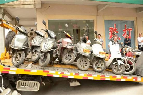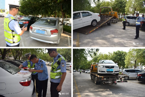 市交警联合特警、榕城公安分局等来到市政府和市公安局机关大院检查,对无牌无证摩托车、超标电动车以及乱停放、假牌套牌的小汽车、“僵尸车”等进行查扣,出动拖车对其进行清运。当天上午共查扣汽车4辆,摩托车(含电动车)69辆。当天下午,公安部门继续对汇景一期,西苑小区,市公安局宿舍内区违法违规车进行查处,共查扣汽车4辆,摩托车148辆。