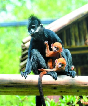 世界首例珍稀黑叶猴龙凤胎跟游客见面