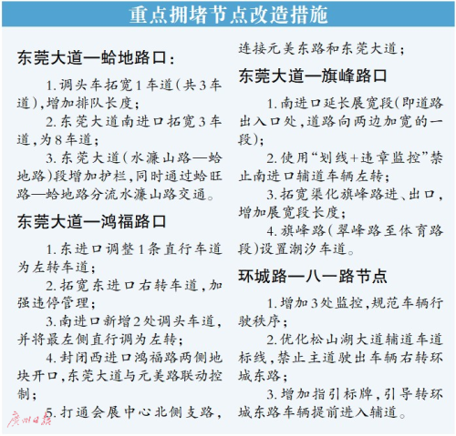 经综合梳理,联席办公室提出东莞大道、环城路等道路12个重要拥堵节点,主要采用车道调整、路口渠化,优化交通组织及信号灯配时、局部加宽等措施进行治理,其中旗峰路(翠峰路至体育路段)还将设置潮汐车道。