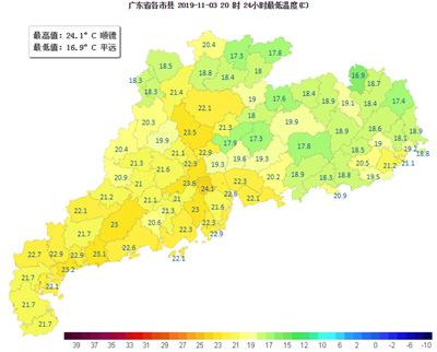 11日4日,我省大部分市县晴天,昼夜温差加大。最低气温:粤北的北部市县13℃~17℃,其余市县17℃~21℃。
