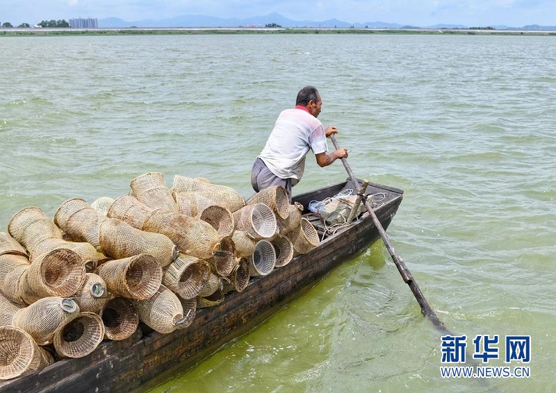 佛山市南海区九江镇沙口社区举行开渔仪式,为渔民授开渔旗。新华网发(梁平 摄) 渔民驾着小艇放虾笼。新华网发(梁平 摄) 渔民捕到新鲜的鱼。新华网发(梁平 摄)