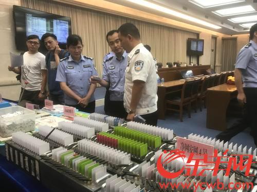 省公安厅召开新闻发布会,现场展示大批利用网络犯罪的工具。记者 黄巍俊 摄经过数月的侦查经营,在查清其犯罪网络、人员构成、组织体系和活动轨迹后,警方于近期在深圳、珠海、惠州、湛江、潮州以及北京、重庆、苏州、常州等地同步发起集群收网行动,一举摧毁上述侵犯公民个人信息黑产团伙。