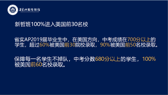 省实AP保障每一名学生不掉队,中考分数680分以上的学生,100%被美国前60名校录取。