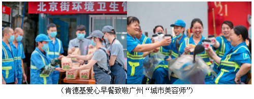 春天花开羊城,位于北京路步行街旁的肯德基光明广场广府文化餐厅,这天举行了一场特别的“花”式早宴,宴席上的主角是来自北京街环卫站的女环卫师傅们。