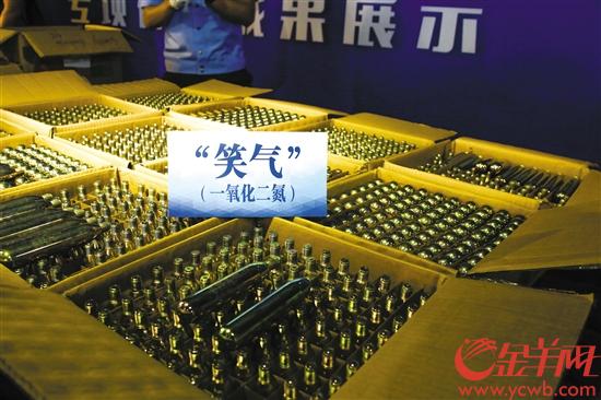 5月21日,在省公安厅禁毒局的统筹指挥下,中山警方联合佛山、江门警方侦破一起非法经营“笑气”案,抓获涉案嫌疑人9名,在江门市捣毁“笑气”加工点1个,在佛山市和中山市古镇镇捣毁“笑气”仓库2个,缴获“笑气”(一氧化二氮)成品4万支、笑气原料气罐22罐(每罐存储“笑气”约25公斤)、合成大麻素烟油2.2万支以及“笑气”灌装设备、其他设备等一批,涉案金额60多万元人民币。目前,此案仍在进一步审理中。