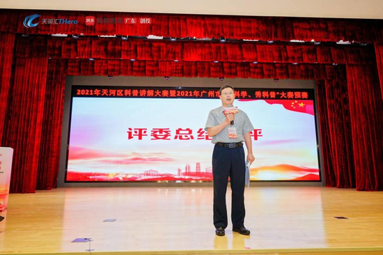 (选手竞演环节)大赛评委组组长广东省实验动物监测所所长、研究员朱才毅在总结点评中表示,本届天河区科普讲解大赛亮点频现,参赛选手们的选题贴近生活,聚焦社会热点,科学性与专业性极强,让在场的观众朋友们获益匪浅,为天河区营造了学科学、爱科学、讲科学的良好社会氛围。