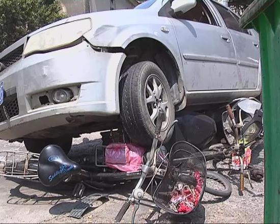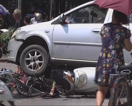 受伤市民:当时我骑着自行车,在摩托车和自行车的中间,那辆小汽车轰的一声就撞过来,摩托车被撞了之后就倒向我和一位老人,我的腿就被压在下面。