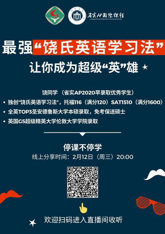 2月12日(周三)20:00,省实AP将在线上开展线上分享会,停课不停学。届时,饶同学不仅会在线传授申请英国大学与美国大学时的独家秘籍,还会倾情分享“饶式英语学习法”,并解答自己对于英语学习的困难,让大家爱上英语。