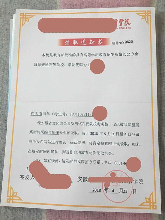 录取通知书“对我这个十年没有摸课本、考前只复习了两个月、也不算聪明的人来说,这个分数算好的了。”徐孟南称,他报考的三个院校的校考也都通过了,最终他选择了一所历史悠久、人文气息相对较强的院校,“挺高兴的,毕竟一开始就想上这所学校,算是如愿以偿。专业的选择可能是因为和喜欢文字有关吧。”他表示,报考当地的院校也是考虑到父母和孩子都在,上学不想离家人太远。