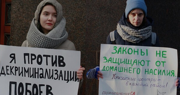 俄罗斯女性举标语反对“轻度家暴除罪化”,称法律没有保护人们不受家暴侵害。