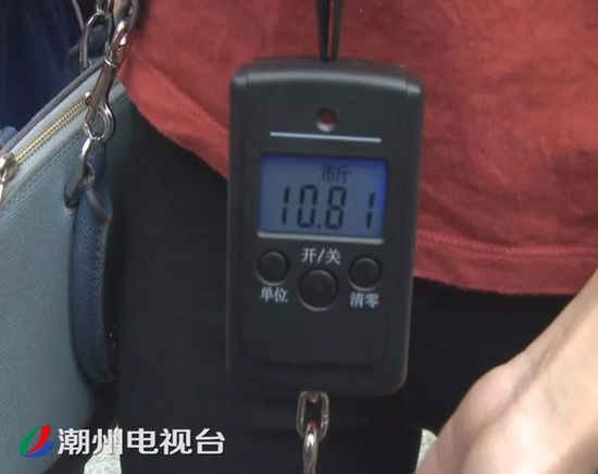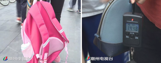 记者现场称了10个孩子的书包,最重的出现在这个五年级小男生的背上,重量达到14斤多,相当于一次性背着约15瓶500毫升的矿泉水。