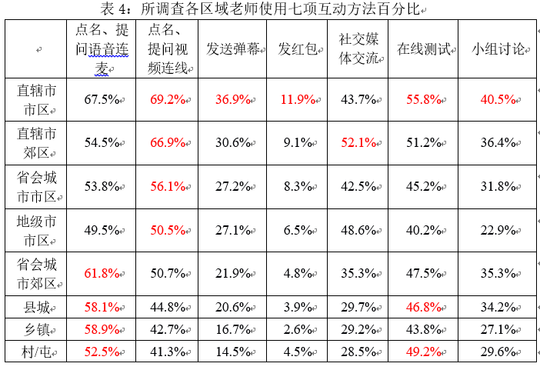 各区域的教师具体在使用七项互动方法的百分如表4,直辖市区的教师在语音视频连线、发弹幕、发红包、在线测试、小组讨论等互动方法上的使用都是最多的。
