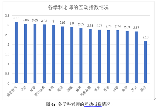 3、在总体互动指数上,高中老师互动指数最高,信息技术学科的互动指数最高。重点/示范学校教师的互动指数明显高于一般学校,直辖市区教师的互动指数明显高于镇、村。教龄为5-10年的教师互动指数最高。