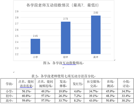 互动指数,本研究列举了七项主要的在线教育互动方式:提问语音连麦、提问视频连线、在线测试、社交媒体交流、小组讨论、发送弹幕和发红包,七项互动方式各计为1分,加总计算后作为“互动指数”。互动指数的含义是指使用互动方式的类型多少。