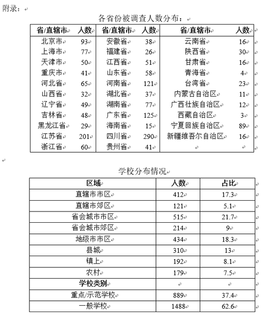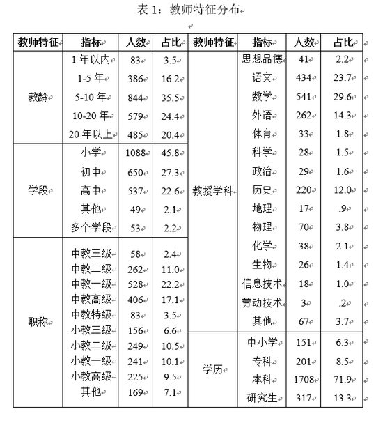 调查首先按省份配比样本,然后通过极数云平台采集数据。剔除无效样本后,得到2377份合格样本。具体样本的地区分布、教师特征分布如下,由于职高与中职教师样本较少,后面分析中就不再对这两类数据进行统计,教授学科去除了兼授学科数据。各省份和学校分布情况见附录。