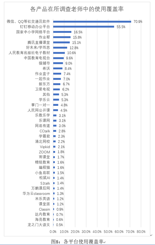 2020年3月8日-12日,该报告研究团队调查了全国2377名中小学教师,使用39个在线教育产品授课的互动形式、互动效果以及使用评价等情况。