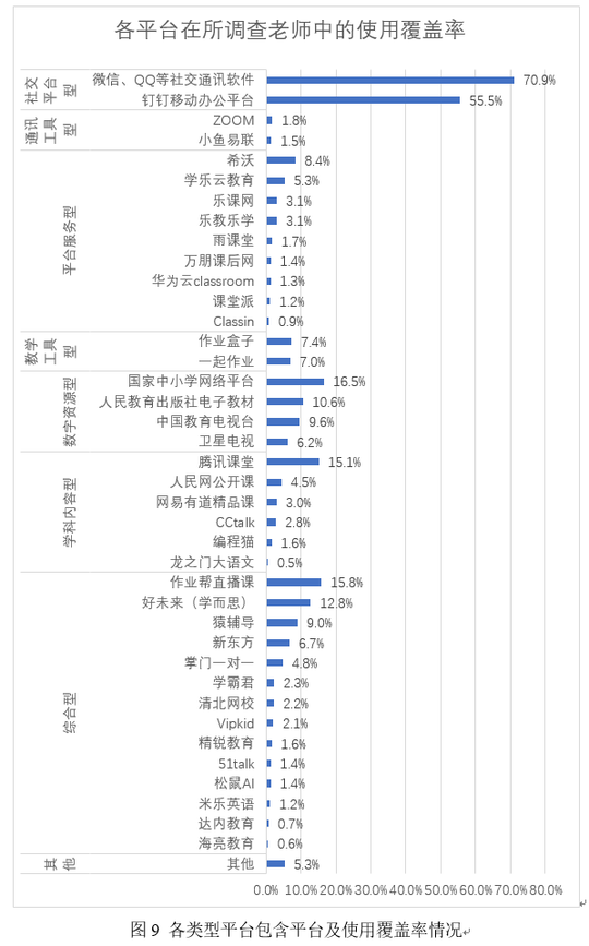 教师在疫情阶段用于在线教学的平台可划分为七类: