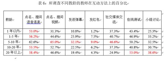 从教龄分析,教龄为5-10年的教师互动指数最高,最低的是教龄1年以内的新教师。进一步通过ANOVA分析,发现教师不同教龄对互动指数影响显著(F=20.698,P=0.00)。不同教龄的互动指数都存在显著差异,1年以内与1-5年差异有一点显著,与5-10年差异非常显著,与其他教龄差异不显著。1-5年与5-10年差异非常显著。5-10年与所有阶段教龄的差异都非常显著。不同教龄的教师具体在使用七项互动方法的百分比如表6,发弹幕、发红包次数最多的是5-10年教龄的老师,在线测试互动方法使用最多的是20年以上教龄的老师。