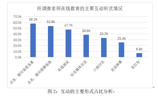 其次,具体到互动方式上,教师使用最多的是语音和视频连麦,分别占比58.1%和53.8%,其他互动方式使用率均不足50%,网络互动中常见的弹幕(发言、留言)、红包等方式应用不多。