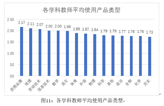 根据各学科教师平均使用产品类型分析,思想品德教师使用产品类型最为丰富,进一步通过ANOVA分析,发现不同学科的教师使用产品类型数量差异显著(F=6.109,P=0.000)。
