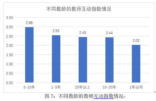 研究人员通过分析发现:互动形式越丰富,老师的评价效果越好。重点/示范学校教师的互动指数明显高于一般学校,直辖市区教师的互动指数明显高于镇、村。教龄为5-10年的教师互动指数最高。