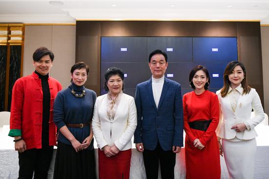 广州新年舞会总策划人胡慧莲(左三),与参与今年舞会表演的艺术家们、新闻发布会主持人蔡婷子(右一)合影。每年广州新年舞会的国标舞表演都会掀起全场高潮,今年舞会邀请了在世界体育舞蹈大赛中荣获殊荣的拉丁舞新秀梁煜祺、符佳佳登台表演。两位选手在发布会上即兴起舞,技惊四座。