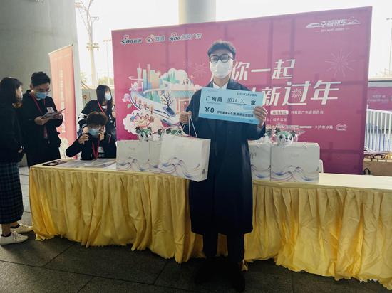 2021幸福列车自启动以来,活动获得了社会各界的广泛关注,并得到邓老药业、点都德等爱心企业支持。目前大部分乘客已通过快递的形式拿到了车票,为方便少数未能及时取到车票的乘客顺利乘车,新浪广东在广州南站增设临时取票点。现场有工作人员引导尚未取到车票的乘客顺利取票乘车。早上9点多,幸福列车D2812乘客陆续进站候车。为了帮助乘客顺利地到达候车室,幸福列车在安检处、候车室等关键位置作了乘车指引,志愿者们身穿黑色马甲,热心地为乘客提供相应的指引和帮助。