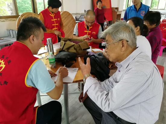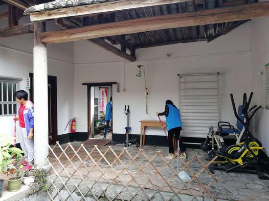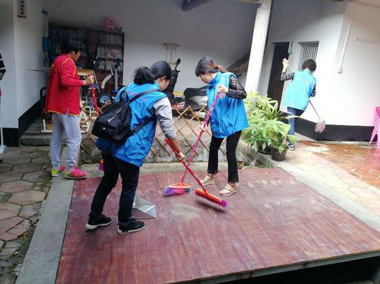 志愿者们打扫义诊的场地,为义诊的开展做准备