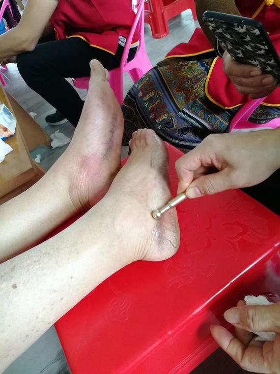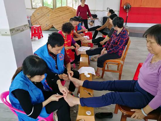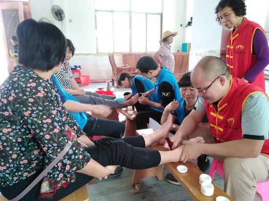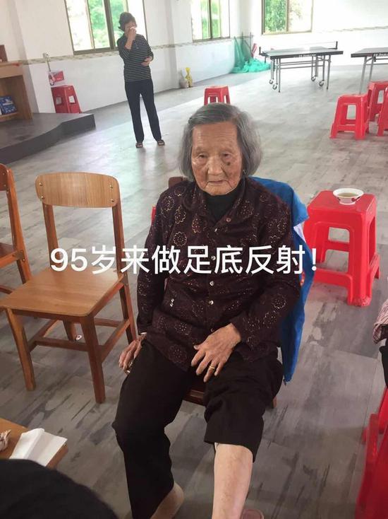一位95岁的老奶奶特别祥和,也来做足底反射保健。