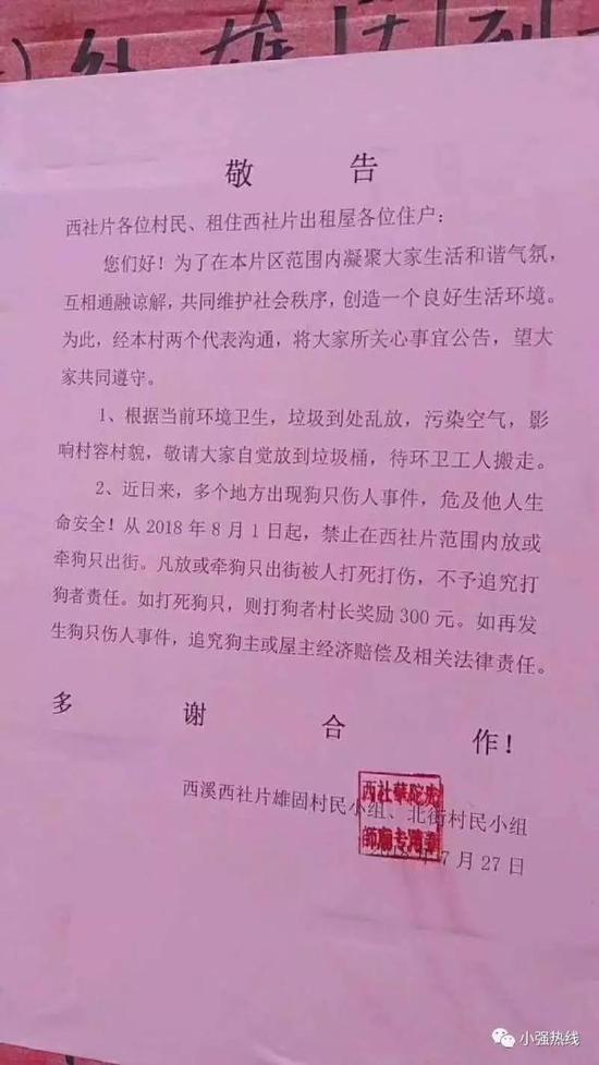 佛山一村小组发布"禁遛狗"通知 称打死狗奖三百元
