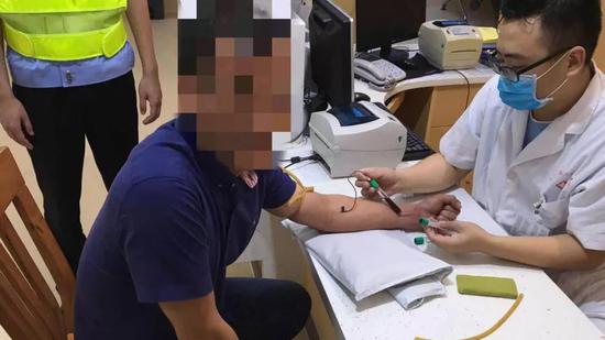古警官递上酒精测试仪让男子吹气,可男子一开始并不配合检查,古警官警告男子再不配合就要到医院抽血检查,男子顿时愣了愣,深吸一口气使劲吹,数值直接飙红。随后交警将司机带到拱北医院抽血检查,结果为129.8mg/100mL,醉驾。▼