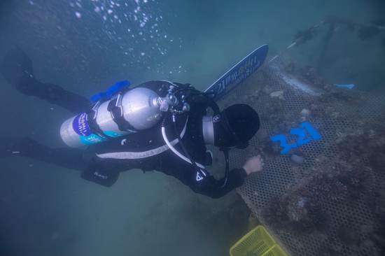 科普结束后,志愿者小队换上潜水装备,下海清理海底垃圾,收集珊瑚残肢固定在特定区域的苗圃上。未来,待这些珊瑚稳定成长、恢复生机后,将会被放回海底的礁石上,形成金沙湾海域美丽的风景线 。在扶植过程中,志愿者将收集到的珊瑚固定成“321”的字样,希望藉此进一步传播世界森林日的主题,唤醒公众的海洋保育意识。