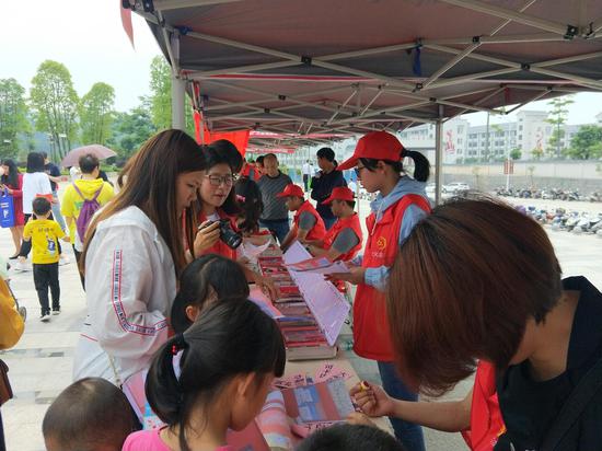 禁毒宣传活动以“毒品知识知多少”为主题,活动现场,禁毒志愿者向参加活动的近400名群众派发了禁毒宣传小册子,并为他们讲解毒品模型及有关知识,现场让群众对毒品模型进行辨认,引导群众牢记毒品知识,并将毒品名片卡放入对应放入毒品模型中。据悉,活动当天团县委组织开展了以“青春心向党•建功新时代”为主题的文明实践活动,将毒品知识和其他文明宣传活动通过任务卡的形式吸引群众积极参与,现场群众只要将3张以上毒品名片与毒品模型配对成功即算完成小任务,活动结束时群众可凭借任务卡上的盖章数量进行礼品兑换。
