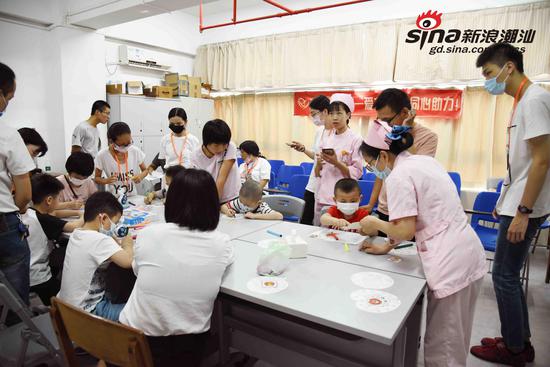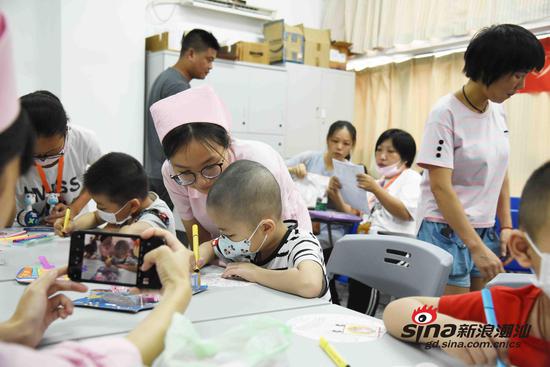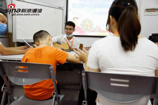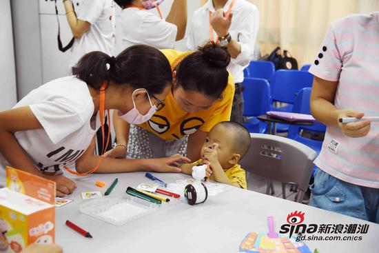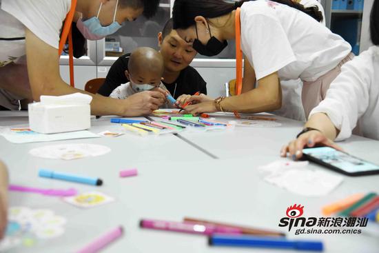 活动现场,义工抱起吉他弹唱表演,暖心的歌声让活动室变得格外温馨。据悉,本次的绘画活动吸引了近20名癌症患儿和家长前来参与,其中最小的患儿仅有一岁多。为了完成任务,义工们和家长联手合作,帮助小宝宝完成手绘图画。