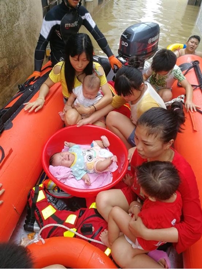暴雨致汕头损失5.08亿 消防员潜水用盆运送儿童