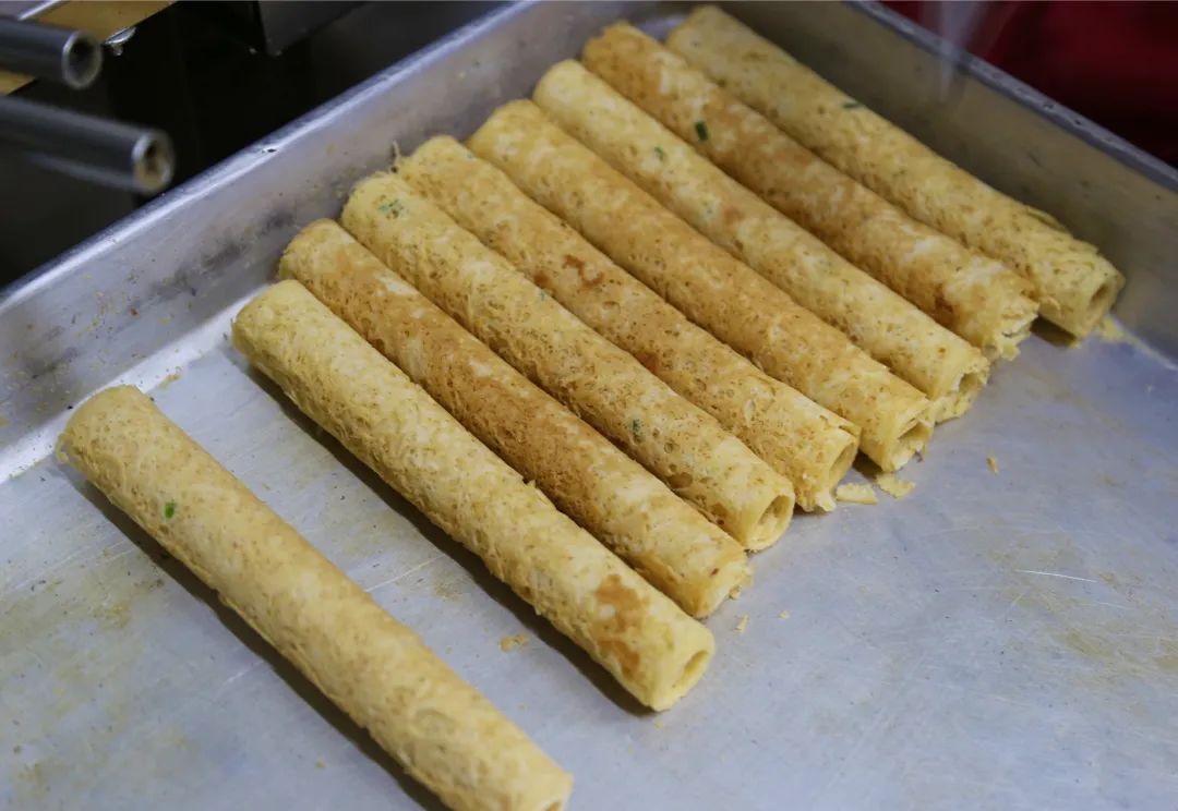 走进店内,老板娘梁姐正在蛋卷机前做蛋卷,鸡蛋面粉的温热香甜弥漫整家店。酥脆的蛋卷轻轻一咬便簌簌往下掉,吃的时候得用手接着!梁姐说,做蛋卷的蛋浆看似简单,主要是鸡蛋、面粉和糖,但要把蛋卷做好还是要控制好温度,并且要有娴熟的包卷手势。