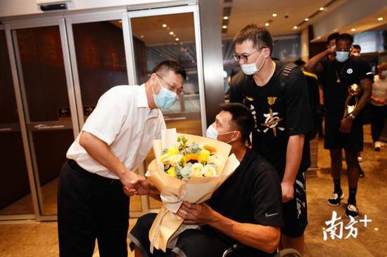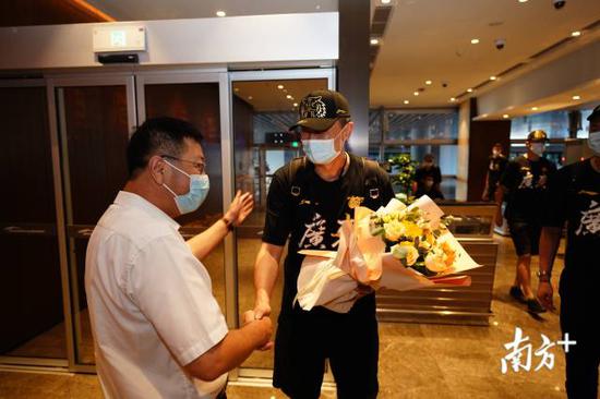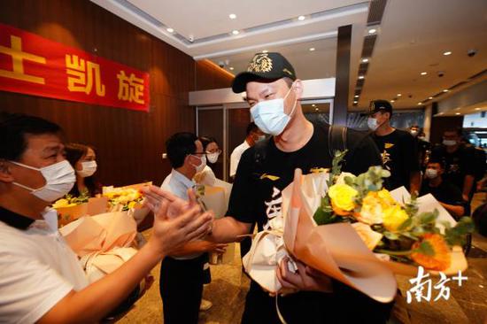15:20,在机场的国内到达等候区,广东队全体成员现身。东莞市委副书记白涛带领接机团向夺得CBA总冠军的宏远队队员献花。