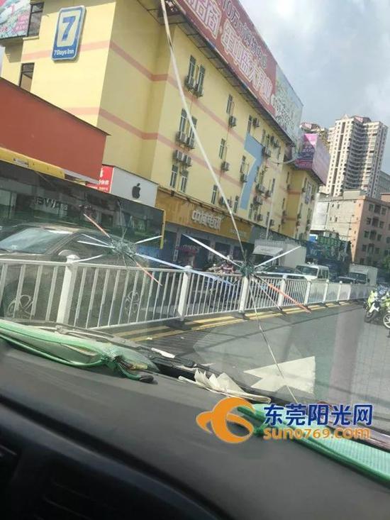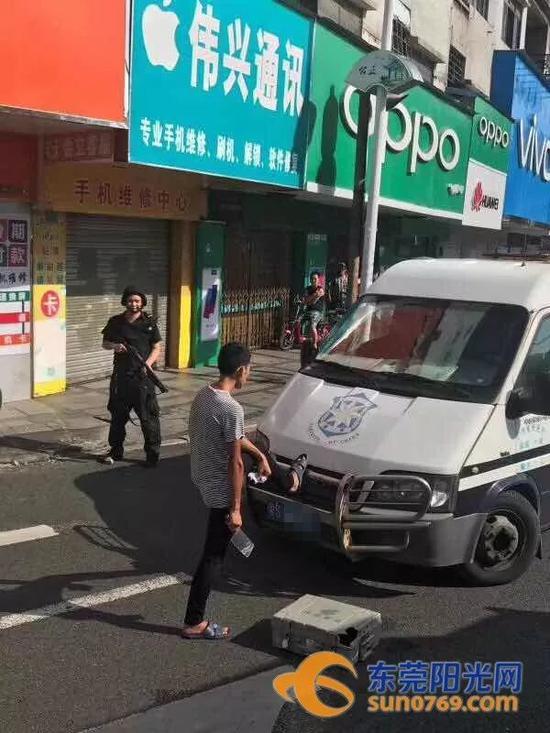 △男子爬上运钞车车头与警察对峙 △男子拦截运钞车 △运钞车挡风玻璃遭破坏来源:东莞阳光网