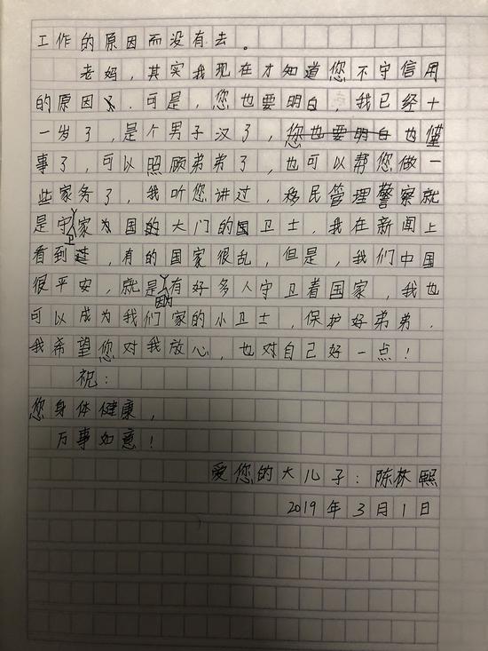 老妈,其实我知道您不守信用的原因,可是您也要明白,我已经十一岁了,是个男子汉了,也懂事了,可以照顾弟弟,也可以帮您做一些家务了。我听您说过,移民管理警察就是守卫国家大门的卫士。我在新闻上看到,有的国家很乱,但是我们中国很平安,就是因为有好多人守卫着国家。我也可以成为我们家的小卫士,保护好弟弟,我希望您对我放心,也对自己好一点!