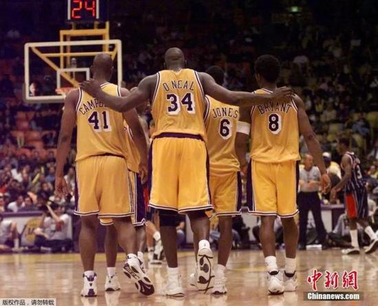 资料图:1999年2月5日,湖人以99比91的成绩击败火箭队,球赛结束后,大鲨鱼奥尼尔搂着他的兄弟们一起享受胜利的喜悦。那时候科比在湖人的球衣还是8号。那一年,他遇到了他以后的妻子,瓦妮莎。
