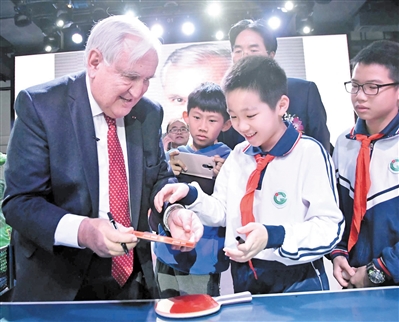 拉法兰此行访穗行程满满。在广州美术学院的演讲中,拉法兰分享了中法两国之间文化交流的重要性。演讲结束后,拉法兰与广州的小学生进行了一场“迷你”乒乓球赛,赛后还与小球员互赠了乒乓球拍。随后,拉法兰参观了十三行博物馆和粤剧艺术博物馆。