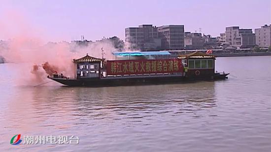 9月28日上午,潮州市公安消防支队联合市海事局、市航运公司、市公安局水上分局和市红十字会等部门,在韩江流域举行灭火救援演练,检验多部门联动化解水上险情的救援能力。