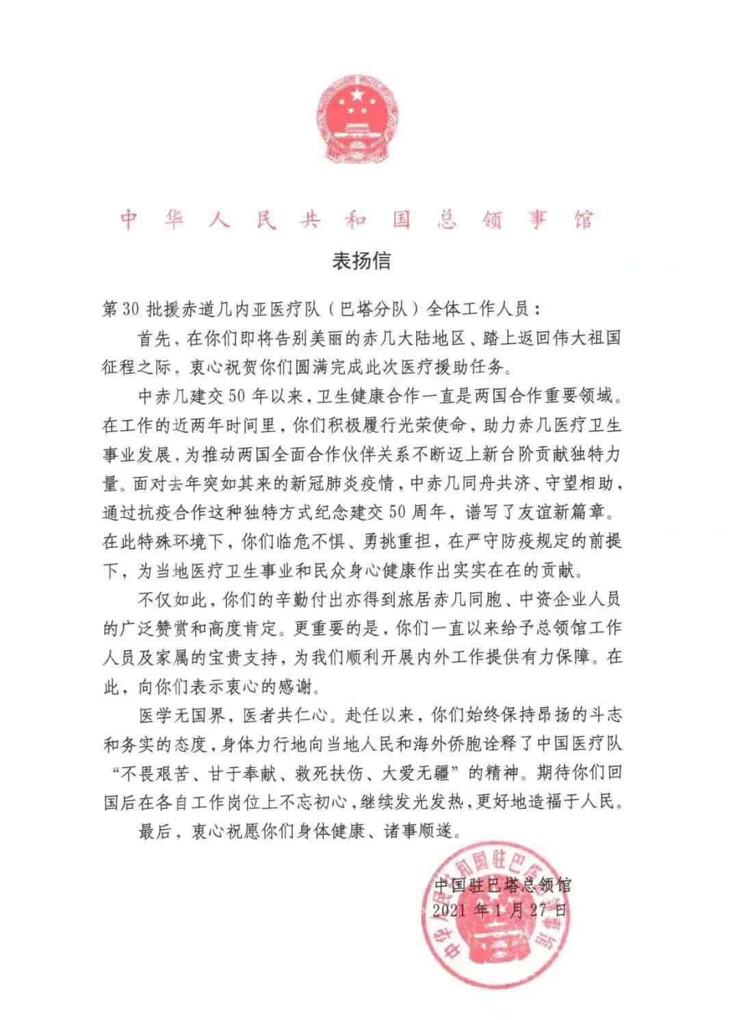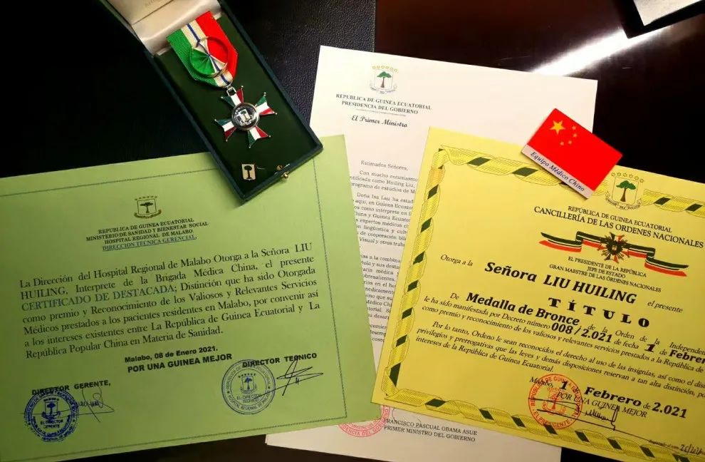 在东莞医疗队归国前,2月1日,赤道几内亚总统奥比昂先生签发总统令,决定授予中国第30批援赤几医疗队国家独立勋章,这是赤几国家最高荣誉。2月2日,奥比昂先生亲手为驻总统府的4名队员佩戴勋章,并亲笔写下感谢信。