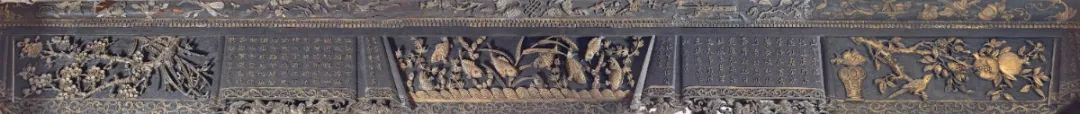 此封檐板位于正门屋檐之下,以梅兰竹菊、戏曲人物为主要题材,以高浮雕、透雕等工艺刻成,巧夺天工,世所罕见。尤其戏曲人物刻画细致,神情生动。博古架布置了古书(《谏果回甘》)、字画、香炉、香器筒、茶盏、水烟壶等,反映 出与寻常百姓人家迥然相异的文人雅趣,也反映了当时的生 活风尚,颇有文化价值。南社明清时盛产莞香,博古架上布 置的香炉、香器筒尤其带有浓郁的乡土特色。
