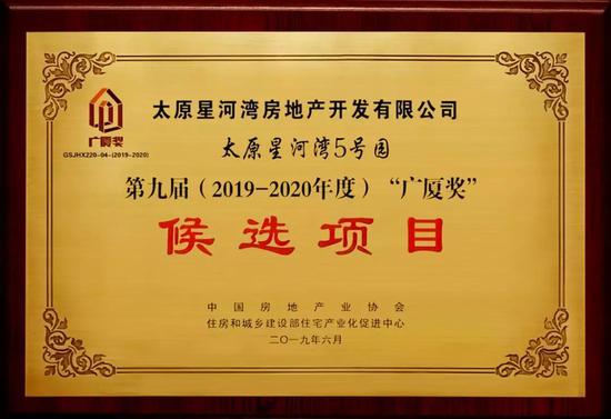 会上,举行了第九届年度“广厦奖”第二批候选项目颁牌仪式。 太原星河湾5号园入选。