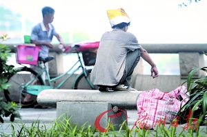 昨日下午,珠江边,一名流浪者蹲在石椅上休息。记者莫伟浓 摄