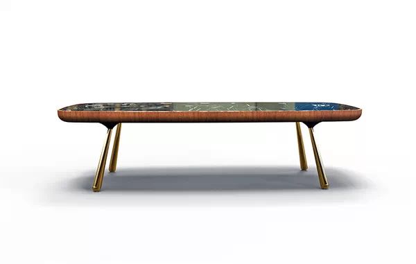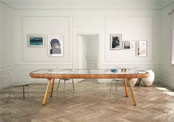这是由 André Teoman 工作室设计的:万花筒桌子(Kaleidoscope table)。从上图的俯视角度来看,它很像去年流行的一款苹果手机壳,桌面像是用不同的板块拼接出来的。顾名思义,它的桌面设计灵感来自万花筒,以中间为中轴线,两边纹理规律对称分布,形成一种镜像效果,同时给人有一种破碎的美。