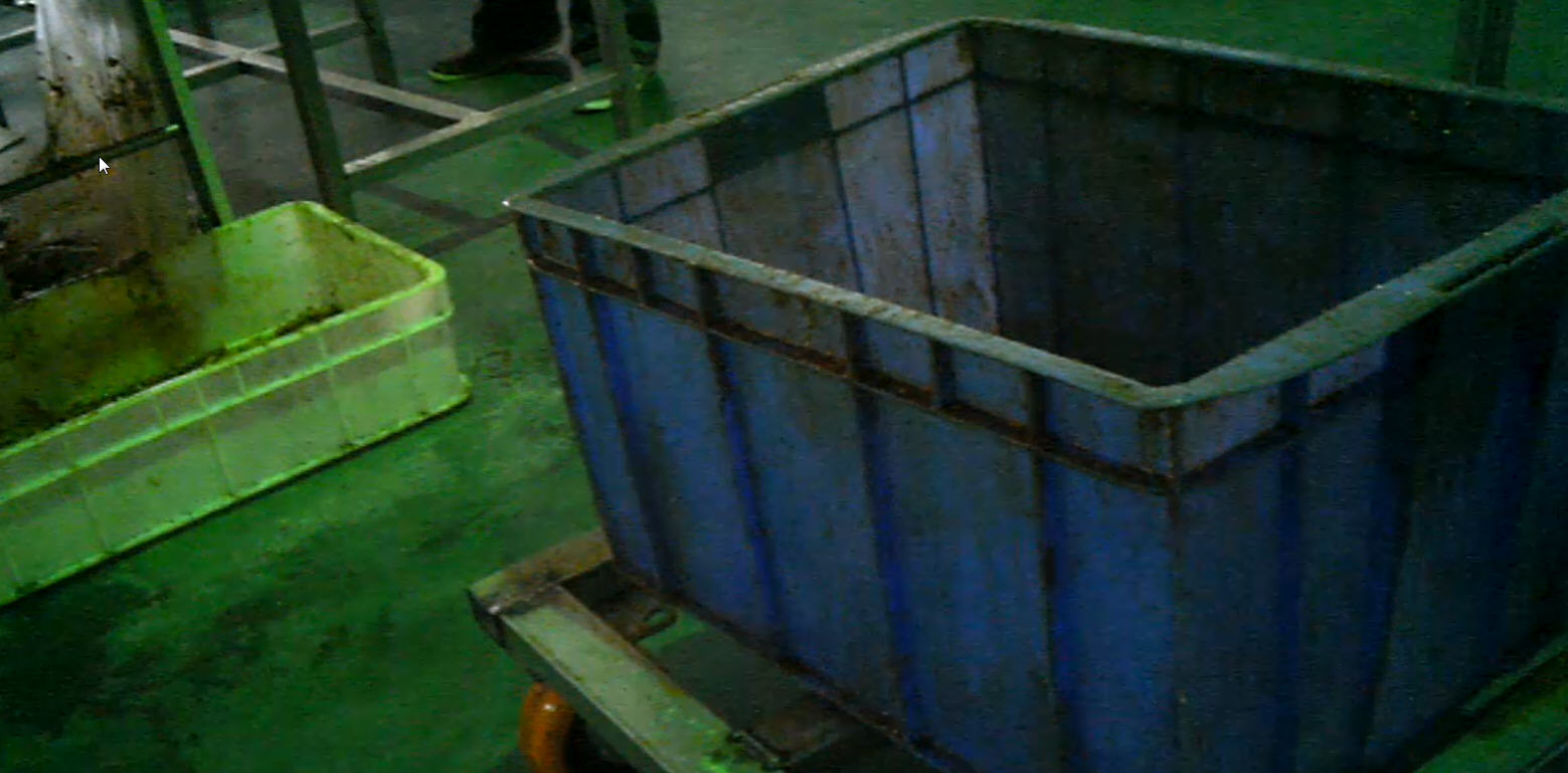 位于河南省通许县工业园的开封劲松食品有限公司生产厂房内,运送辣条的蓝色塑料箱上面布满黑色的污物和油渍(3月7日摄 视频截图)。新华社发